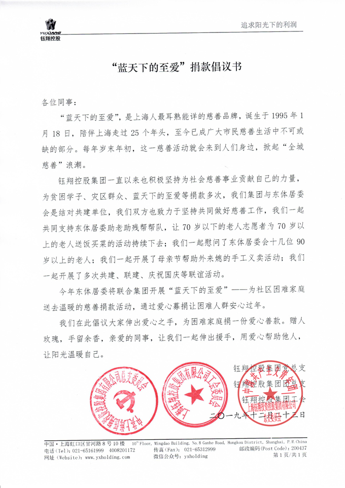 鈺翔控股集團黨團員積極參與“藍天下的至愛”慈善捐款活動