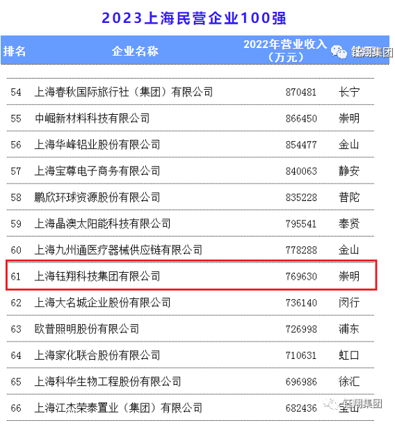 上海鈺翔科技集團有限公司2022年實現營業收入76.96億元,榮獲“2023上海民營企業100強第61名”、“2023上海服務業企業100強第66名”、“2023上海民營服務業企業100強第38名”三項榮譽。