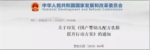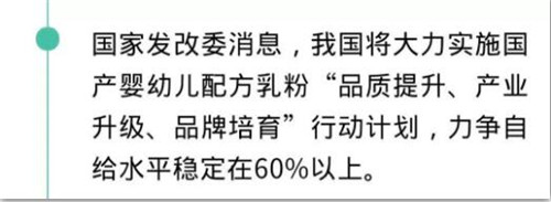 昨天,中華人民共和國國家發展和改革委員會公布了由國家發展改革委、工業和信息化部、農業農村部、衛生健康委、市場監管總局、商務部、海關總署等七部委聯合制定的“《國產嬰幼兒配方乳粉提升行動方案》”,方案指出:我國將將大力實施“品質提升、產業升級、品牌培育”行動計劃,力爭自給水平穩定在60%以上,大力提倡使用生鮮乳生產嬰幼兒配方乳粉。