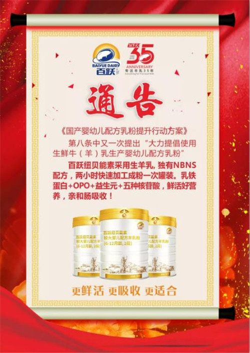 《國產嬰幼兒配方乳粉提升行動方案》的印發為中國乳企的發展迎來了一個好時期,相信在這種天時、地利、人和的大環境下,百躍紐貝能素定能緊抓機遇、迎接挑戰,助力國產羊乳的全面崛起!