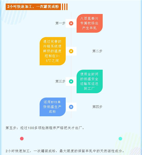 殺菌工藝是我們與瑞典利樂公司合作開發超高溫滅菌器VTIS。對濃度52%的濃奶進行直接超高溫超瞬間滅菌(143攝氏度,0.33S)和閃蒸,0.33秒之內閃蒸一切異味,保證了鮮羊奶的營養元素不流失,確保新鮮。